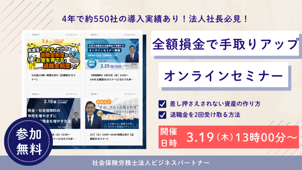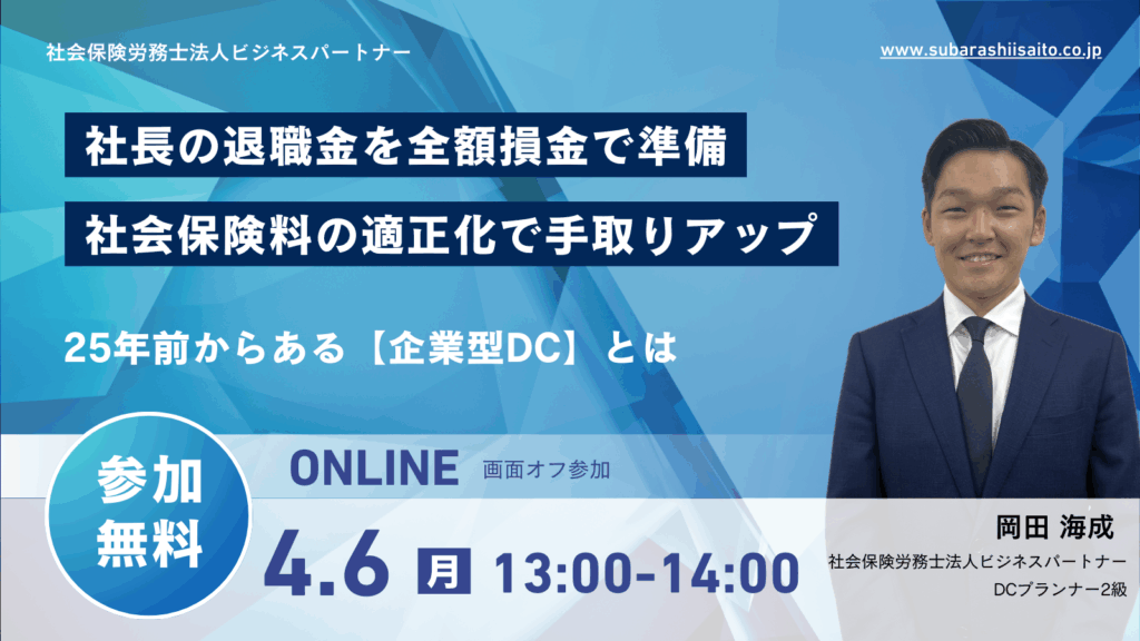 弊社主催のセミナーの一覧です。ぜひご参加ください。 4月6日(月) 13:00~14:00 税理士向け【企業型DCセミナー】 【参加無料】4月1日(水)13:00〜14:00 企業型DCセミナー(どなたでも参加可) 【参加無料】3月19日(木)13:00〜14:00 企業型DCセミナー(どなたでも参加可) 過去セミナー 税理士向け【企業型DCセミナー】 過去セミナー